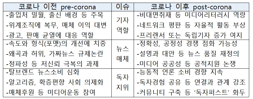 '포스트 코로나' 시대의 저널리즘은 전례없는 상황과 맞닥뜨린다. 디지털 뉴스 시장의 위기 환경보다 도시 공동체의 변화가 중대한 영향을 미칠 것이다. 출산율 저하와 고령화, 양극화, 인공지능(AI)과 노동의 종말 같은 지금까지의 전율과 동요는 비대면화, 원격 서비스, 사회적 차별, (지역)분산 대응과 자국 공급망 지키기 등 새로운 긴장의 에너지를 만나고 있다.