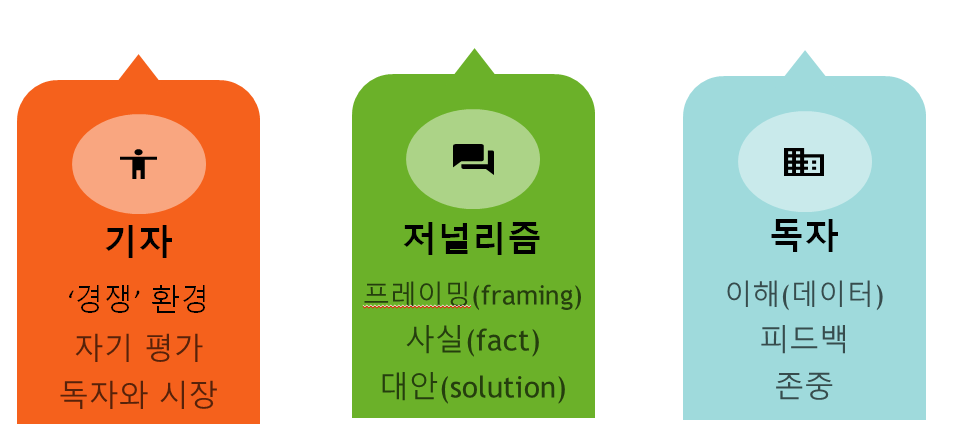 언론의 문제는 기자(뉴스조직), 저널리즘, 독자의 영역에서 일어난다. 첫째, 기자는 '경쟁'의 인식을 바꿔야 한다. 스스로에 대한 평가도 교정해야 한다. 무엇과 경쟁하고 있고 무엇으로 보상받고 있는지 냉정한 자기 검증이 필요하다. 그래야 독자와 시장이 제대로 보인다. 지금은 기자 혼자서 미친 듯이 일하는 것뿐이다.