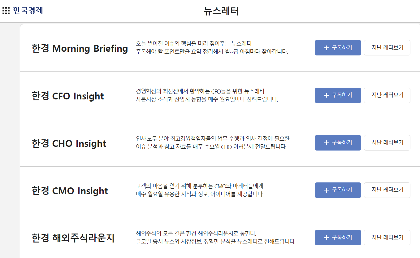 일부 언론사를 중심으로 '뉴스레터'가 부상했다. <한국경제>는 WSJ를 벤치마킹한 특정 타깃-기업의 CHO, CFO, CMO 등을 대상으로 하는 뉴스레터를 잇따라 내놨다. 3~4년 전부터 뉴스레터에 공을 들여온 <중앙일보>도 카테고리를 늘리는 등 재정비했다. <조선일보>도 명상(종교) 국방 등 전문기자를 앞세운 뉴스레터 서비스를 오픈했다.