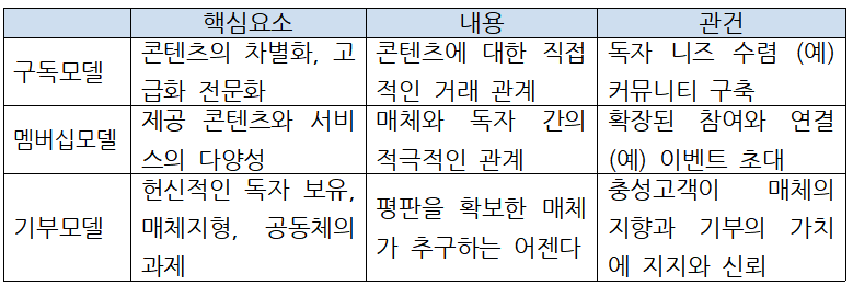 첫째, '독자' 관계입니다. 구독자를 유치하는 과정입니다. 뉴스 소비자가 구독자로 전환할 수 있도록 무엇을 어떻게 할 것인가입니다. 콘텐츠 전략 수립 같은 뉴스생산과정의 개선도 있을 것이고요. 뉴스유통 전략을 효율적으로 바꾸는 일도 필요합니다. 또 최종 뉴스 소비자인 독자에게 우리 브랜드와 상품을 어필하는 마케팅 측면도 살펴봐야 합니다. 뉴스조직(기자)와 독자 간 커뮤니티도 하나의 터닝 포인트입니다. 지금은 조직은 지국을 관리하거나 정산을 처리하거나 배달지연 등을 처리하는 오프라인 환경에서 부합하는 측면이 더 크다고 할 것입니다. 멤버십의 업그레이드가 중요합니다.