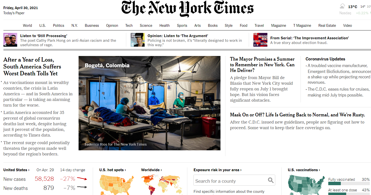 <뉴욕타임스> 기자들은 2019년 한 해 동안 기사를 포함해 5만9000건의 콘텐츠를 생산했다. 팟캐스트 '더 데일리' 월간 청취자는 1000만명이다. 2020년 7월 자체 다큐멘터리 TV 프로그램을 제작해 동영상 플랫폼 훌루에서 상영했다. 여러 스타일의 콘텐츠를 다양한 플랫폼에 내놓는다. 양과 질을 동시에 추구한다. 핵심은 중요한 기사를 재미있게 쓰는 것이다. 기자들은 1700명에 달한다(블룸버그 2700명, WSJ-다우존스 등 1400명, 워싱턴포스트 800명). 기자해고도 반복된다.