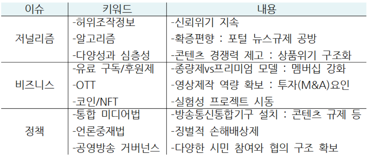 2021년 뉴스 미디어 시장의 핵심 키워드는 '알고리즘', '허위조작정보(가짜뉴스)', '구독모델'로 꼽았다. 포털 뉴스서비스는 편집 알고리즘을 둘러싸고 편향성 시비가 잇따랐다. 언론중재법 개정안을 두고 '과잉입법 vs 사회적 책임 강화' 대립도 이어졌다.