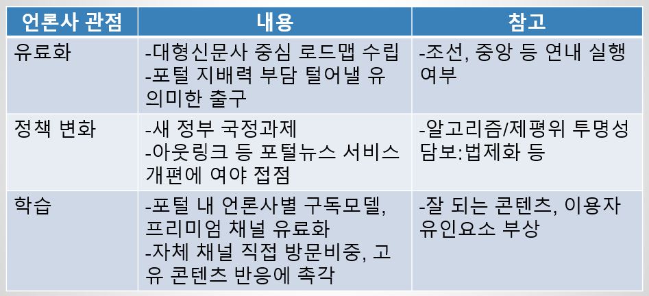 이런 흐름에서 공동 뉴스포털 논의가 언론사에게 현실적으로 다가서려면 풀어야 할 숙제가 적지 않다. 첫째, 기존 포털 뉴스배포 지속 여부 둘째, 공동 뉴스포털 수익모델 셋째, 공동 뉴스포털 기반에서 구독모델 설계 등을 구체적으로 제시해야 한다.