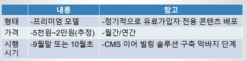 <중앙일보>는 지명도나 전문성 등을 종합해 기존에 테스트를 거친 분야를 포함 13개 영역의 유료 콘텐츠와 전담 기자(팀)들을 가동할 계획이다. 일단 업계에 알려진 내용은 시행 시기 9월말~10월초, 독립적인 프리미엄 채널, 이용 요금 월 5000원~2만원(월간/연간), 5천개 판매목표(미디어오늘은 과거 중앙일보 보고서를 인용해 3천개로 보도) 등이다.