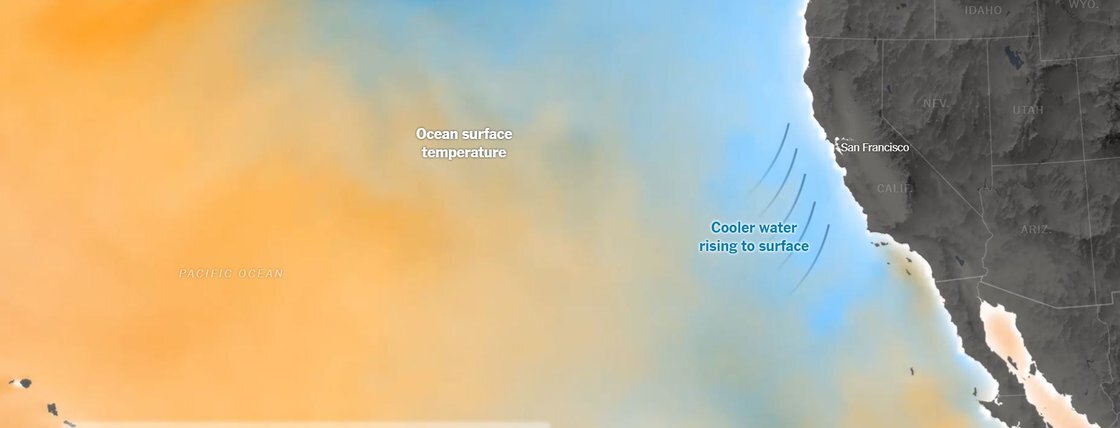 <뉴욕타임스>는 9월 중순 안개 낀 금문교가 장관을 연출하는 샌프란시스코의 여름 시즌을 '기후 변화'로 풀어냈다. <뉴욕타임스> 기자, 사진가는 몇 달을 항만의 안개에 매달렸고, 신문사 그래픽 편집자와 연구원들은 수십년 치의 안개 데이터를 인터랙티브 맵에 담았다.