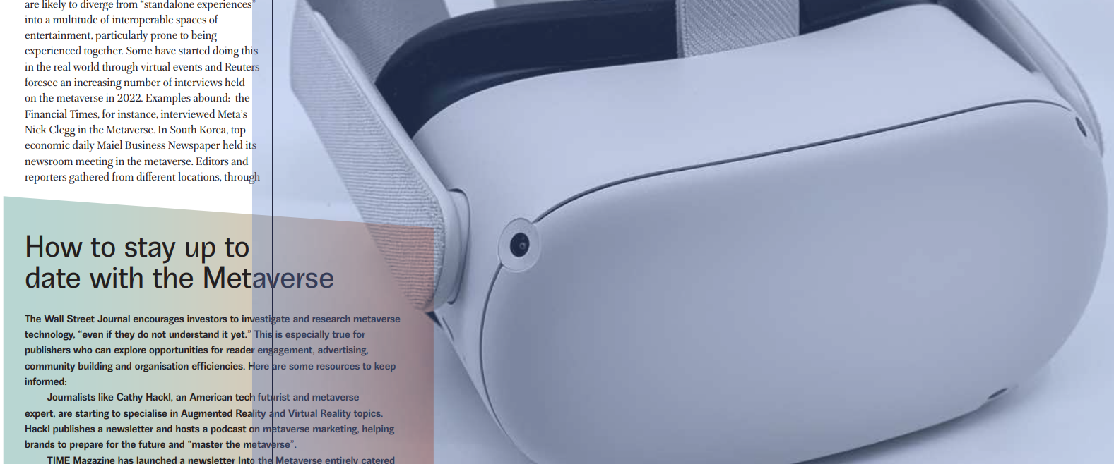 그럼에도 메타버스 아이디어는 미디어 기업 안팎에서 스포트라이트를 받았다. 그것은 언론산업에 획기적 변화가 필요하다는 호소와도 맞물려 있었기에 결코 가볍게 볼 일은 아니다. 거대한 가능성, 잠재력으로 포장이 되는 가운데 언론사의 고민은 하나로 모아졌다. "새로운 세계에 뉴스를 어떻게 끌어들일 것인가"였다.