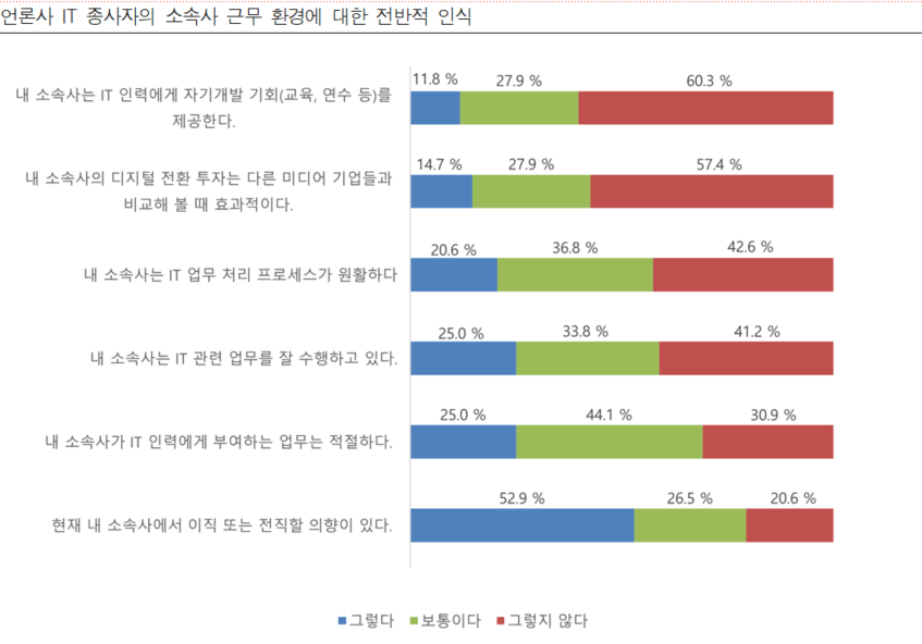 특히 IT 종사자들은 언론사 내에서 재교육 혹은 연수 기회도 전무하고, IT 업무 처리 프로세스나 업무 지시의 명확성이 떨어져 자신 소속사의 근무 환경 전반을 부정적으로 인식했다. A 개발자는 "기자들은 기업, 언론단체 등이 마련하는 해외 연수 지원 기회를 갖지만 개발자는 없다. 이를 기획하거나 제안할 수 있는 책임자도 없다"고 지적했다.