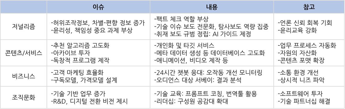 언론사도 콘텐츠와 업무 프로세스에서 생성 AI의 역할이 커지고 있지만 그만큼 신중하게 관리해야 한다. 뉴스조직은 점점 확실한 윤리적 경계를 가진 규범 채택과 다른 한편으로는 더 빠른 혁신 실행의 이슈를 동시에 풀어가야 한다. 전문 인력 확보, 시스템 및 기술 비전, M&A 및 파트너십 등은 당면한 과제다.