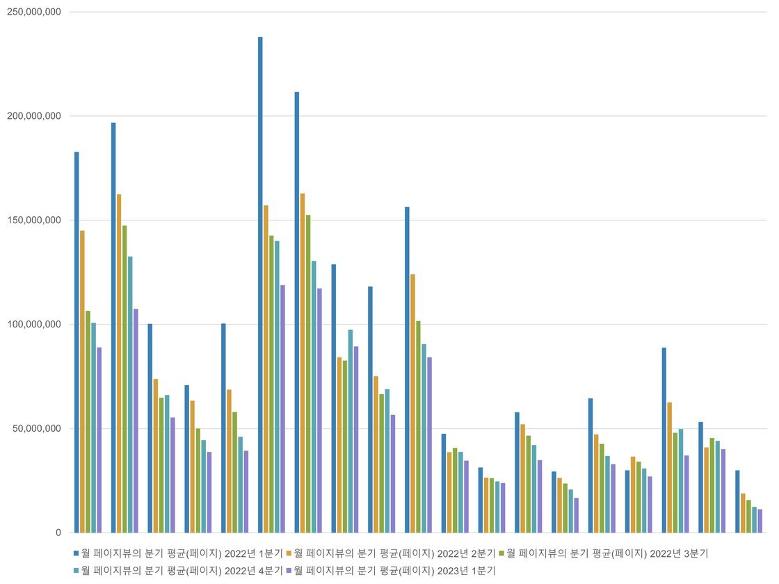 특히 "네이버 모바일 평균 페이지뷰(PV)는 2023년 1분기 기준 전년 1분기 대비 45.5% 떨어졌다. 매체 19곳 모두 페이지뷰가 감소했다. 50% 이상 급락한 매체도 6곳에 달했다." 이같은 네이버 뉴스 이용률 하향세는 일시적인 것이 아니라 지속적일 것으로 예상된다. 검색, 콘텐츠 이용 측면에서 포털사이트의 매력도가 힘을 잃고 있기 때문이다. 팬데믹, 대통령선거 등 대형 이벤트가 아니면 뉴스를 굳이 포털에서 볼 이유도 없는 것이다.