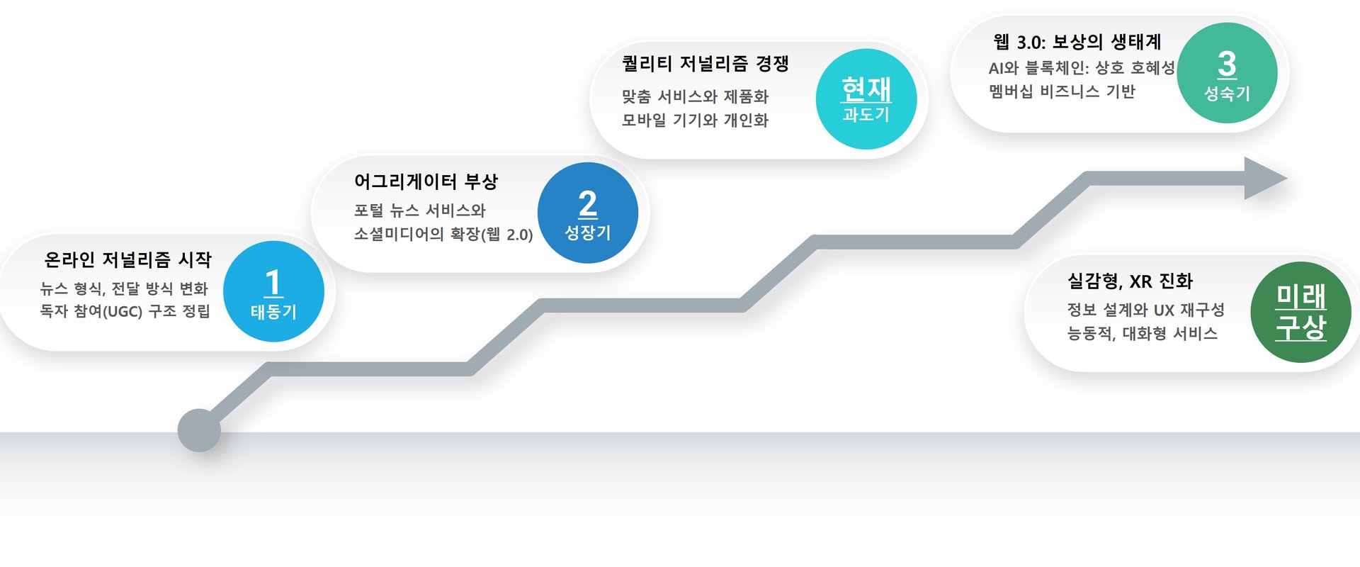 디지털 뉴스 미디어 발전 단계(최상단 이미지). 온라인 저널리즘의 에너지는 이제 기존 테크 플랫폼에 의존하는 2기를 넘었다. 1기는 새로운 형식을 제시하고 독자의 참여(UGC)를 열어두는 생산의 변혁이었다. 앞으로는 독자와 공생하는 보상 생태계를 구현하는 3기를 열어가야 한다.