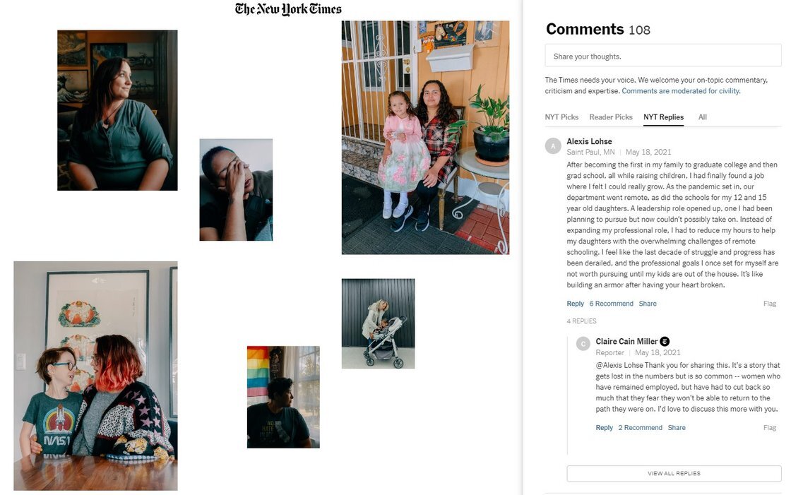 팬데믹으로 육아에 곤란을 겪는 여성들을 다룬 기사에는 독자들에게 일터를 떠났거나 사회적 활동시간을 줄인 경험이 있다면 들려달라고 공지했다. 이에 한 독자는 "원격교육에 힘들어 하는 딸들을 돕기 위해 근무 시간을 줄여야 했다. 지난 10년 간 직업적으로 성취하려는 노력이 물거품이 된 것 같다"고 토로했다. 독자 개개인이 처한 상황과 감정을 나눈 댓글들이 쌓이면서 저널리즘의 가치가 커지는 셈이다.