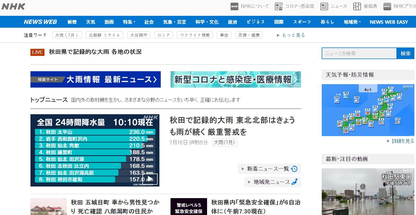 오늘 주요 기사로 한국의 비 피해를 다룬 영국 공영방송 BBC는 네비게이션 바 메뉴에서 기후 섹션을 강조하고 있다. 일본 공영방송 NHK는 뉴스 채널에서 날씨, 기상·재해 두 메뉴를 운영하고 있다. AP통신도 마찬가지다.
