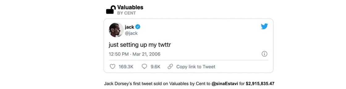2021년 트위터 설립자 잭 패트릭 도시(Jack Patrick Dorsey)는 2006년 자신의 첫 트윗을 NFT로 제작해 290만 달러에 판매했다. 무려 15년간 누구나 원할 때마다 볼 수 있었던 공개 트윗을 센트(Cnet)[1]의 NFT 마켓 플레이스(Valuables)에 올려서 놀라운 거래가 성사됐다.