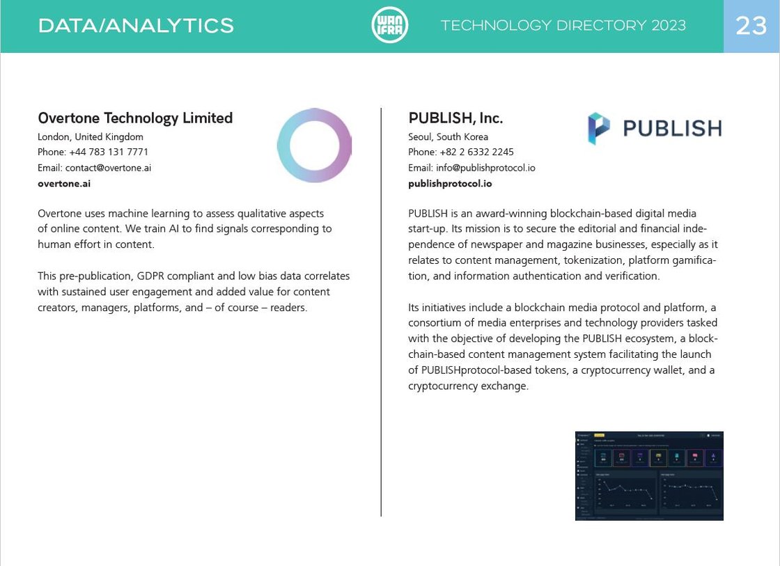 이들 가운데는 세계신문협회 수상 경력을 가진 블록체인 기반 디지털 미디어 스타트업 퍼블리시(PUBLISH)가 한국 기업으로는 유일하게 데이터(분석) 및 상거래(CRM) 두 부문에 걸쳐 소개됐다. 2020년, 2021년 모바일, 스타트업 부문에 각각 공개된 뒤 3년째 등재됐다.