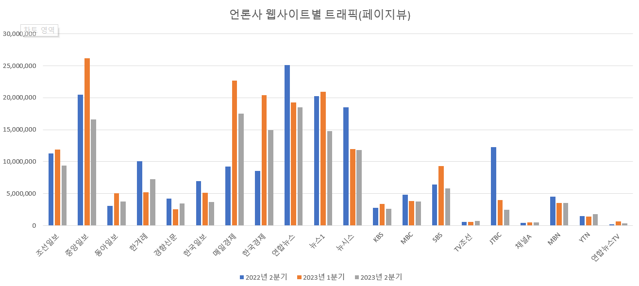 2023년 2분기 언론사 전체 모바일 이용자 트래픽 순위(양대 포털 뉴스섹션 언론사별 트래픽+언론사 웹사이트 트래픽)는 경제지와 뉴스통신사가 선두권을 형성했지만 대부분의 언론사 트래픽은 감소세가 뚜렷했다.