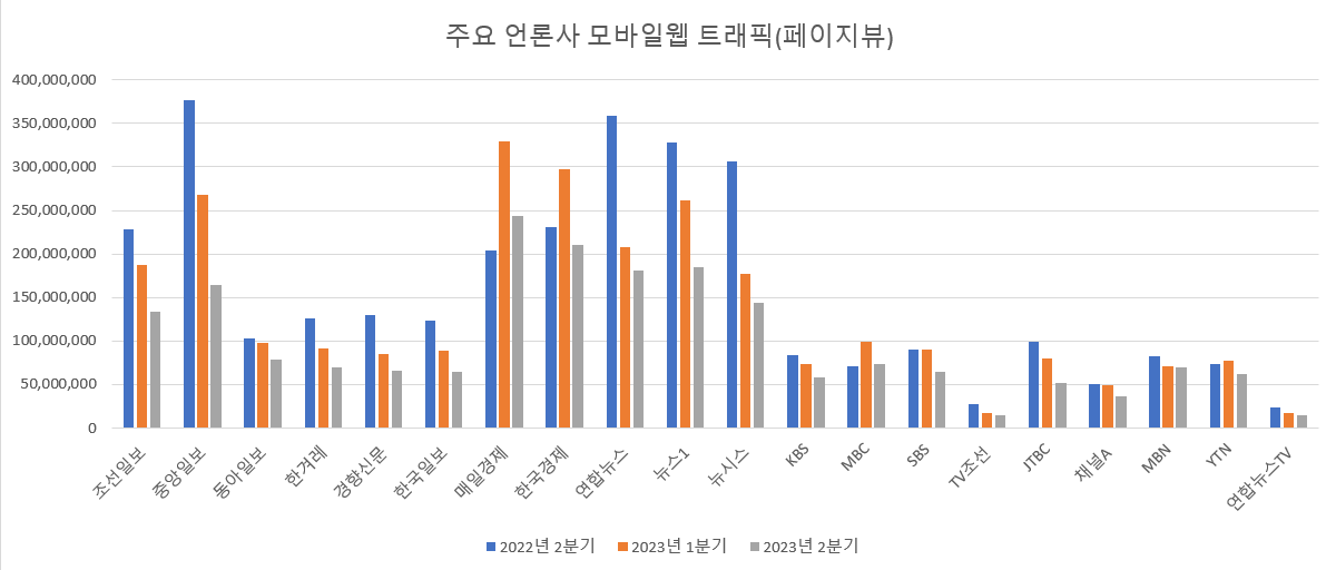 한국 모바일 인터넷 뉴스 이용 트래픽 분석 리포트에 따르면 올해 1분기 대비 순방문자 지표는 조선일보(-17.1%), 중앙일보(-15.1%), 동아일보(-10.4%), 한겨레(-17.2%), 경향신문(-11.5%), 한국일보(-16.0%)로 약세였다. 지난해 2분기 대비 순방문자 지표도 매일경제 한국경제 동아일보(각 -10% 안팎), 뉴스통신사 MBC MBN(각 -10% 초과)을 제외하면 -20% 이상 떨어졌다.