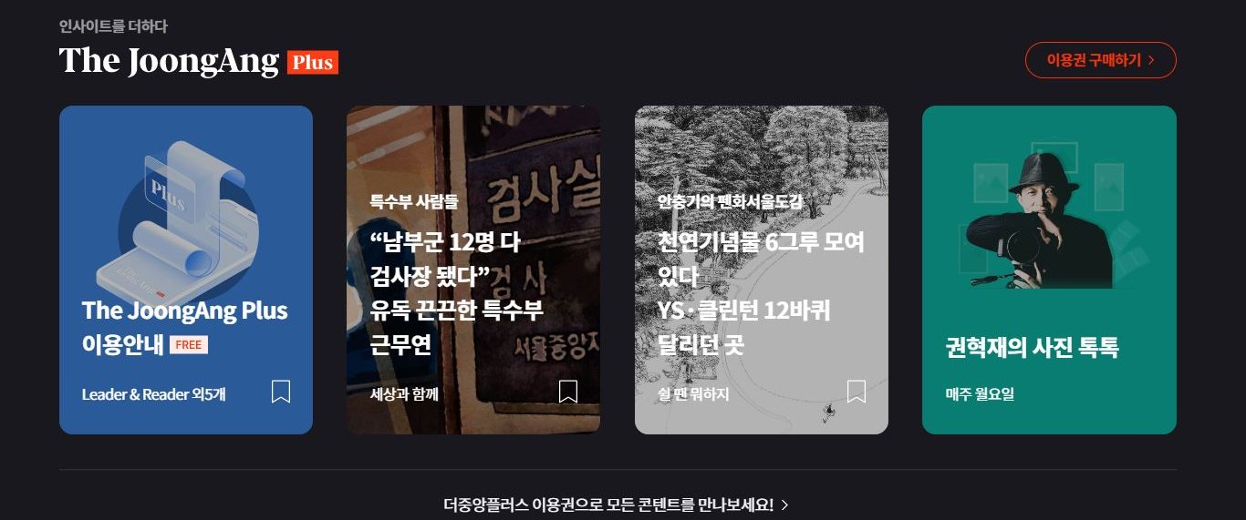 <중앙일보>는 10월 11일 유료 구독 서비스 '더 중앙 플러스'를 내놨다. <조선일보>가 2013년 11월 '프리미엄 조선'으로 유료화 실험을 한 이후 10년 만이다. '더 중앙 플러스'는 '프리미엄 모델'로 매체가 지정한 플러스 콘텐츠를 열람하려면 회원 가입 후 결제를 해야 한다. 지난해 8월 <중앙일보>는 ‘팩플’(IT), ‘헬로패어런츠’(육아), ‘쿠킹’(푸드), ‘앤츠랩’(주식) 등 일부 콘텐츠에 로그인월을 적용해 가입 회원의 반응을 점검했다.