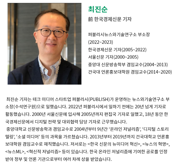 최진순 기자는 테크 미디어 스타트업 퍼블리시(PUBLISH)가 운영하는 뉴스와기술연구소 부소장(수석연구원)으로 일했습니다. 2022년 퍼블리시에서 일하기 전에는 20년 넘게 기자로 활동했습니다. 2000년 서울신문에 입사해 2005년까지 편집국 기자로 일했고, 18년 동안 한국경제신문에서 디지털 전략 및 대외협력 담당 기자로 근무했습니다.