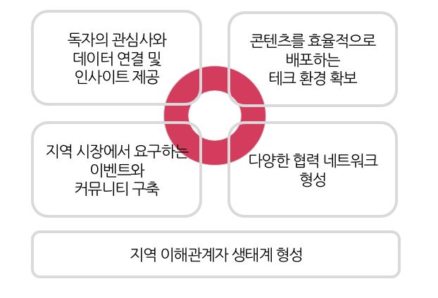 기자들도 디지털 전환에 소극적이다. 지역 언론사는 시군 단위에 주재 기자를 두고 있지만 디지털과는 담을 쌓은 경우가 대다수다. 이들을 포함 구성원들의 인식, 의지를 모아야 할 리더십도 디지털과는 거리가 멀다. 지역 언론의 '지속가능성'은 두말할 나위 없이 지역의 이해관계자를 아우르는 생태계를 형성하는 것이다. '지속가능성 인프라'는 독자의 관심사를 비롯한 지역의 데이터를 확보하고 연결하며, 지역에서 바라는 이벤트와 커뮤니티를 구축하여 다양한 협력 기반을 갖는 것이다.
