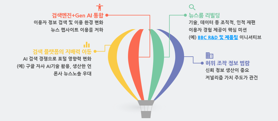 특히 지역 언론의 생성형 AI 도입과 활용은 단기 및 중장기로 구분하여 다룰 필요가 있다. 구성원 전반의 낮은 기술 이해도(문화), 열악한 인프라(기술), 미흡한 사업다각화(경영), 인력 및 조직 공백(체계) 등으로 기술의 목적성•확장성•지속성이 영향을 받기 때문이다. 국내 언론사서 기술 수렴 후 빠른 시기에 충분한 설명없이 중단되며 단절을 빚는 배경이기도 하다. 또 생성형 AI 도입 전략은 (BBC처럼) 콘텐츠 가치 제고-독자 경험 확장-업무 효율화라는 대전제에서 수립해야 한다.