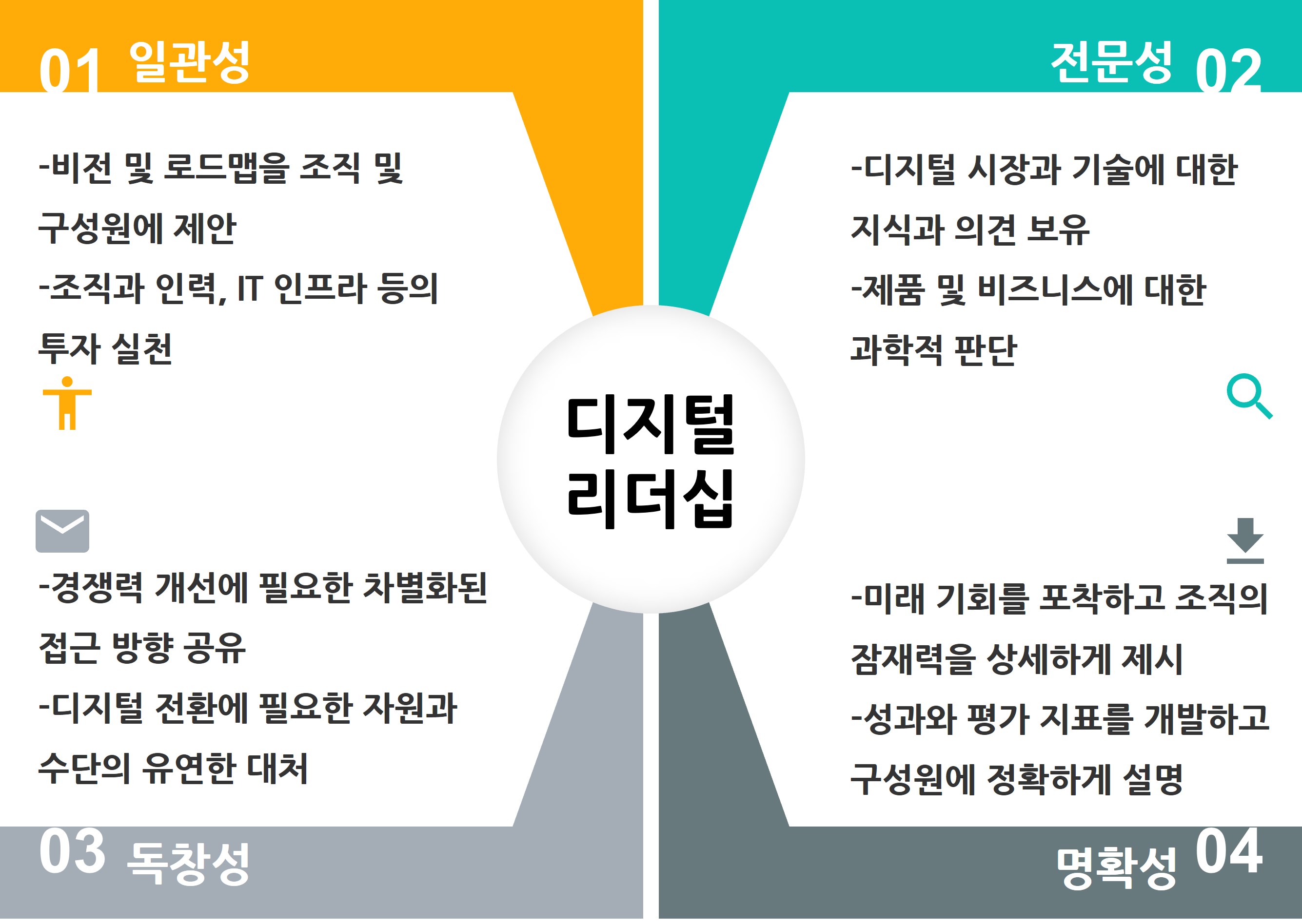 첫째, 디지털 인재를 확보하고 그들에게 매력적인 의사결정권리를 부여해야 한다. 둘째, 오디언스의 요구사항, 선호도, 행동을 정확하게 이해해야 한다. 셋째, 디지털 기술 투자의 가치와 잠재력을 이끌어가야 한다. 넷째, 네트워크의 이해관계자들과의 협력을 주도해야 한다.