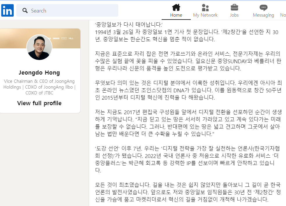 미디어그룹의 대표가 소셜미디어, 컨퍼런스 등 안팎에서 의견을 드러내는 것은 디지털 전환의 밀도와 강도를 드러낸다. 디지털 리더십의 역량은 생태계를 고찰하여 제안하는 '전문성'이 좌우한다. 리더가 자신의 인식을 직접 풀어내는 장면은 디지털 이해도와 관심도를 보여주고, 오디언스가 브랜드를 인상적으로 평가하도록 돕는다. 한국 언론의 권위적인 조직문화를 감안하면 이례적이다.