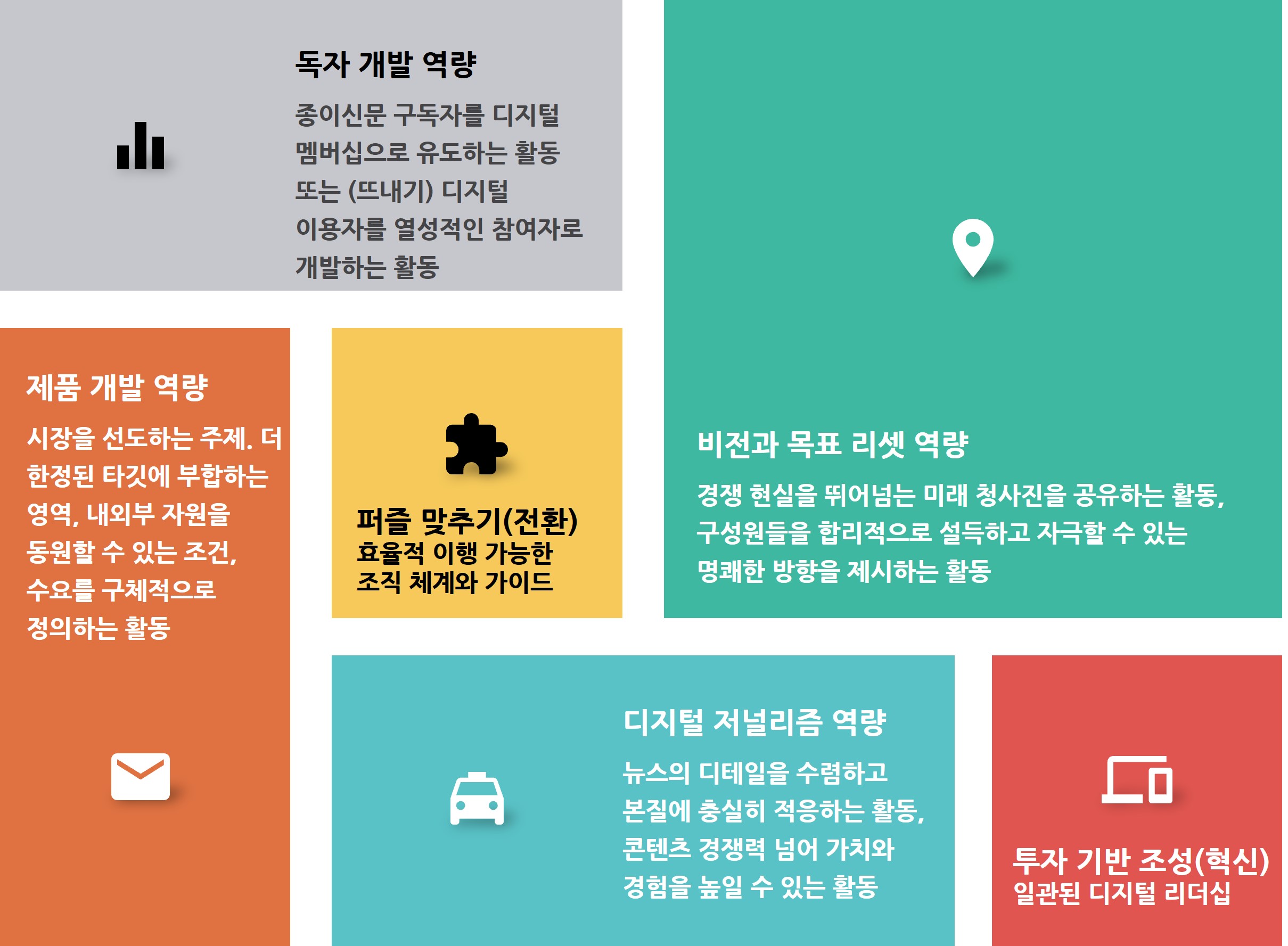 언론사는 디지털에서 작은 성공 모델을 챙겨야 한다. 혁신 동력이고 전환의 시금석이다. 무엇이 성공인가를 정의해야 한다. 한국 언론은 성공을 평가하는 데 인색하다. 디지털에서 어떤 것이 중요한 포인트인지를 각사의 상황에 맞게 재정의해야 한다.