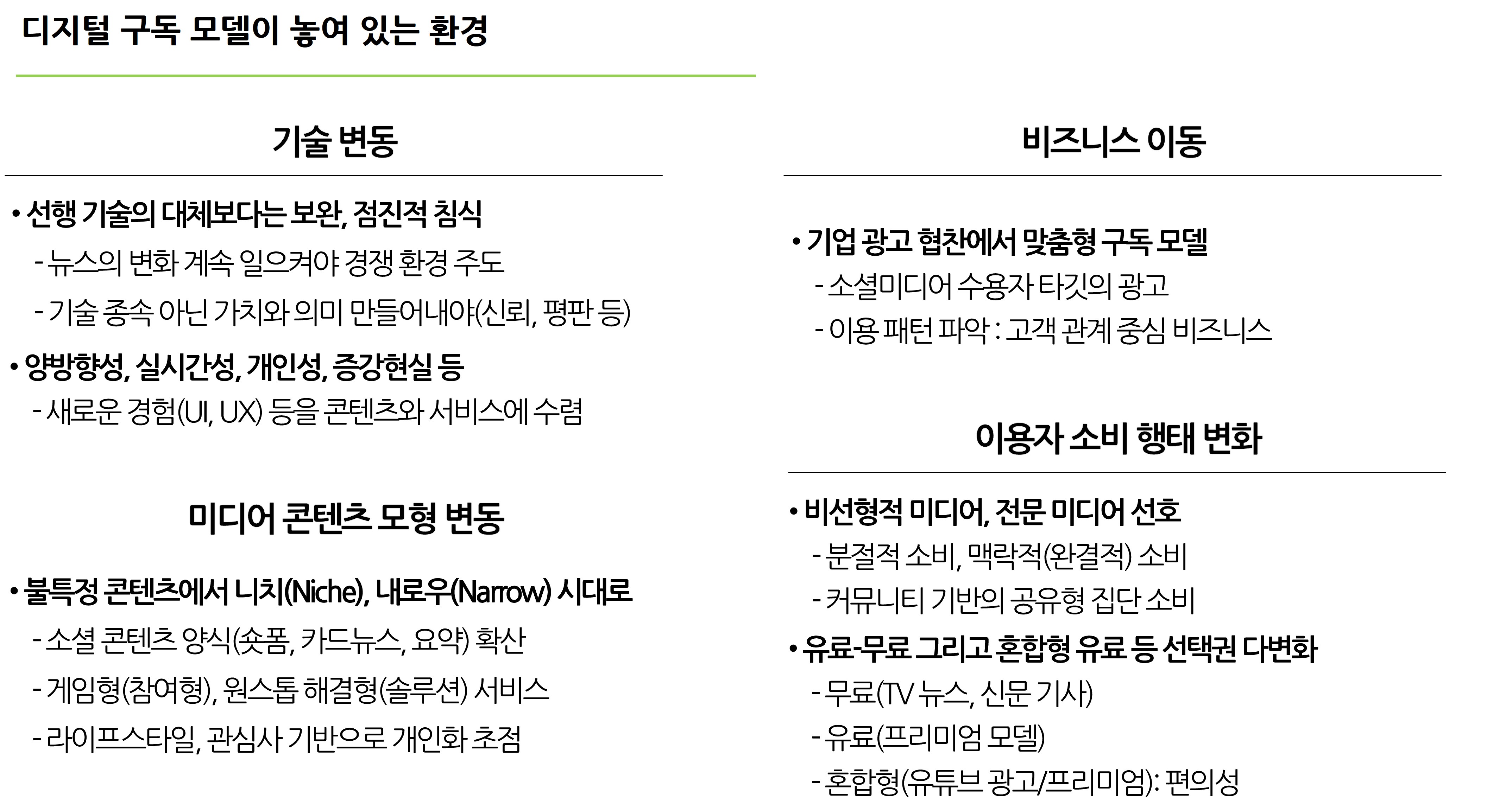 "현재 미디어 환경은 (인공지능 확장으로) 지식정보 생태계의 대전환, 빅플랫폼 뉴스 서비스의 퇴락, 이용자의 뉴스 소비 절약(회피)과 (유튜브 등으로의) 이동 등 심중한 변화를 지나고 있다. 인터넷(소셜미디어), 스마트폰, 증강현실 같은 디지털의 진보로 뉴스 생산과 배포 등 뉴스조직의 대응에서 기술 수용도 확장돼 왔다"며 구독모델은 단지 제품 전략이나 이용자, 마케팅의 차원을 넘어 (라이프스타일) 문화, 인간, 정보의 본질에 접근할 때 지속가능성에 이를 수 있다고 말했다.