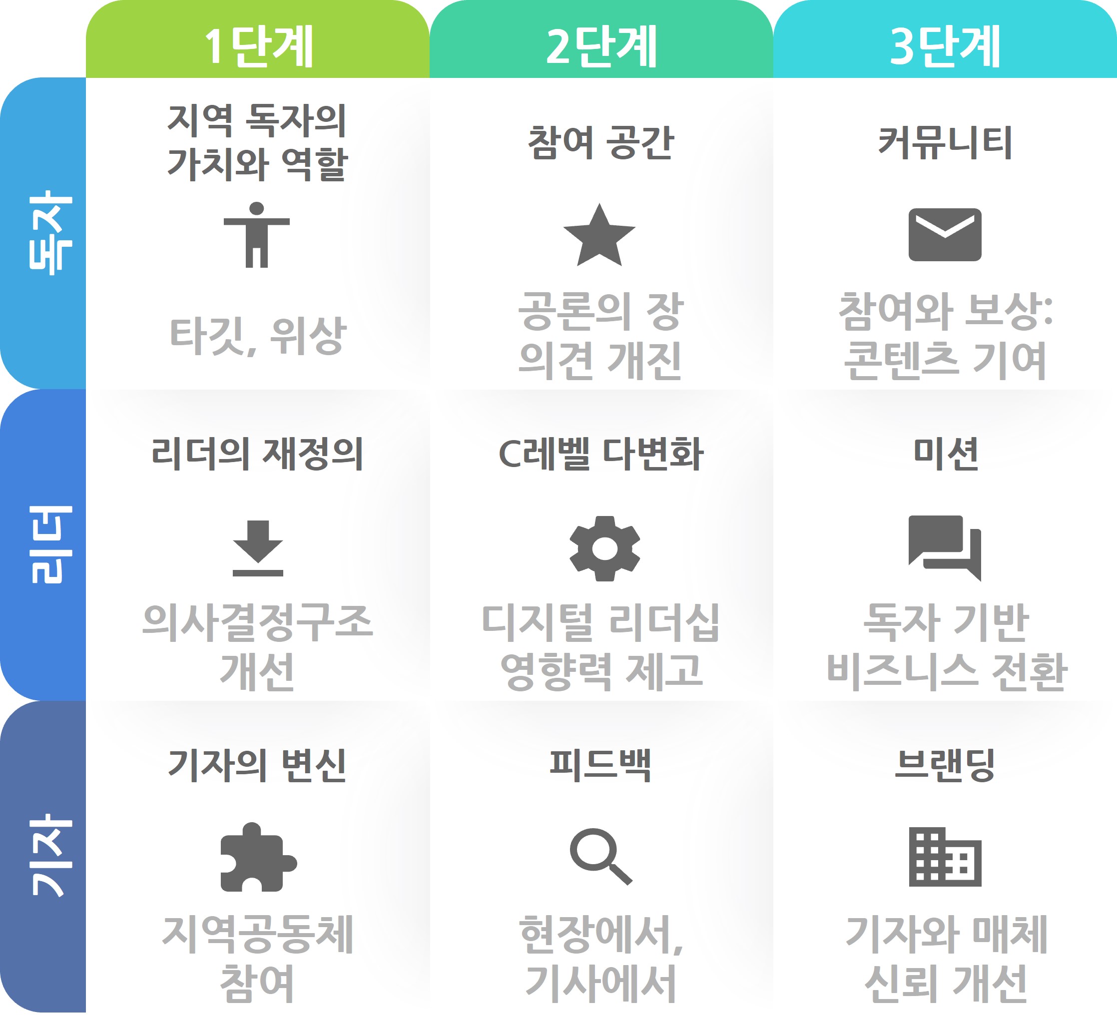 이를 위해서는 리더, 기자, 독자의 역할 변화가 이뤄져야 한다. 리더는 저널리즘의 본질을 실현하는 데 충분한 의지를 가진 인물이어야 한다. 경영 측면에서도 디지털 비즈니스에 정통한 인물이 경영을 이끌어야 한다. 독자와의 관계를 개선하고 독자 마케팅을 추진할 수 있는 스태프도 필요하다.