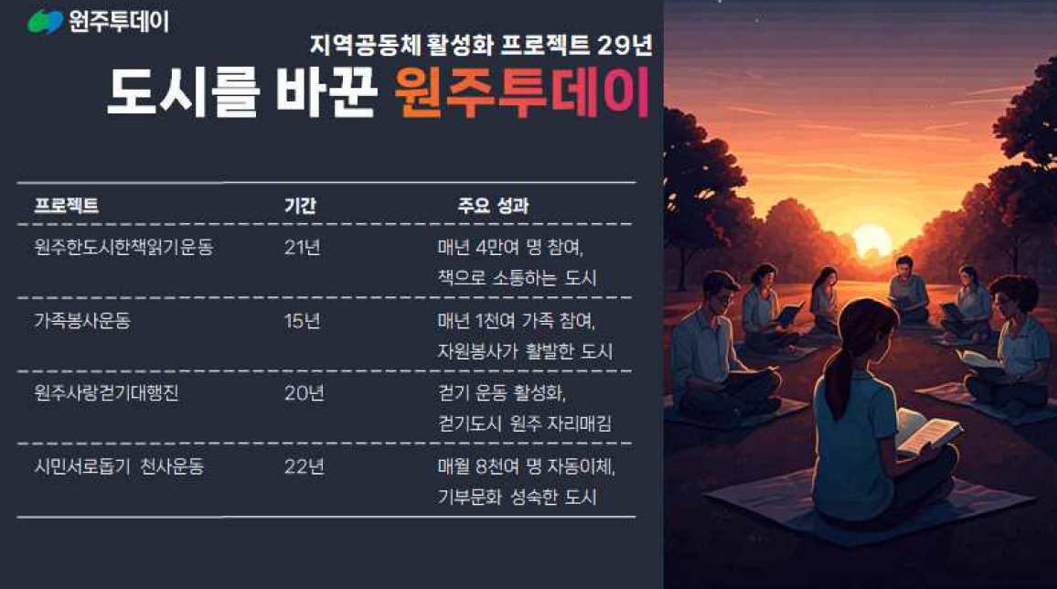 창간 29년째인 원주투데이는 마을공동체 활성화의 동력을 '마을신문'에서 찾고 있다. 4년 동안 마을신문 만들기 프로젝트를 추진, 현재 원주시 25개 읍면동 가운데 11곳에서 마을신문 제작에 참여했다.
