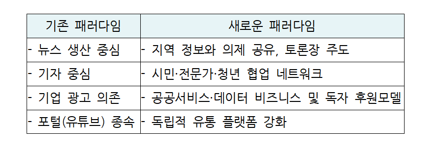 현재의 조직 역량과 시장 경쟁환경을 유지하면 실현할 수 없다. 지역신문은 더 이상 ‘남은 것을 소진하는 산업’이 아니라, 지역의 미래를 설계하는 공공 플랫폼으로 자리 잡아야 한다. 이때 비로소 지역신문에 공적자금을 투입할 의미와 가치도 커질 수 있을 것이다.