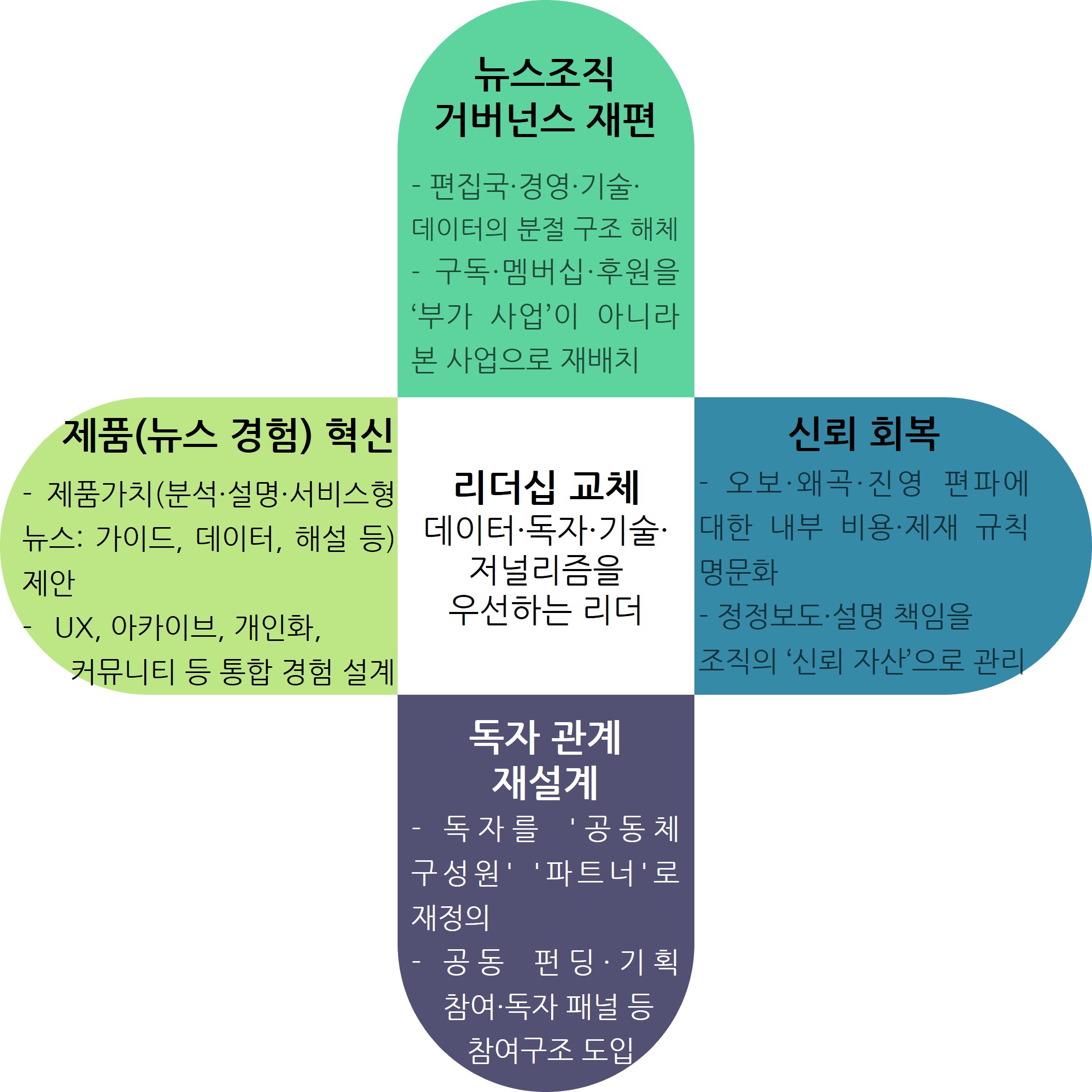 조직과 역량의 전환은 지금보다 더 치열하게 이뤄져야 한다. 편집·경영·기술·데이터가 분절된 구조를 버리고, 독자 경험과 구독·멤버십 전략을 중심에 둔 통합 거버넌스를 지향해야 한다.