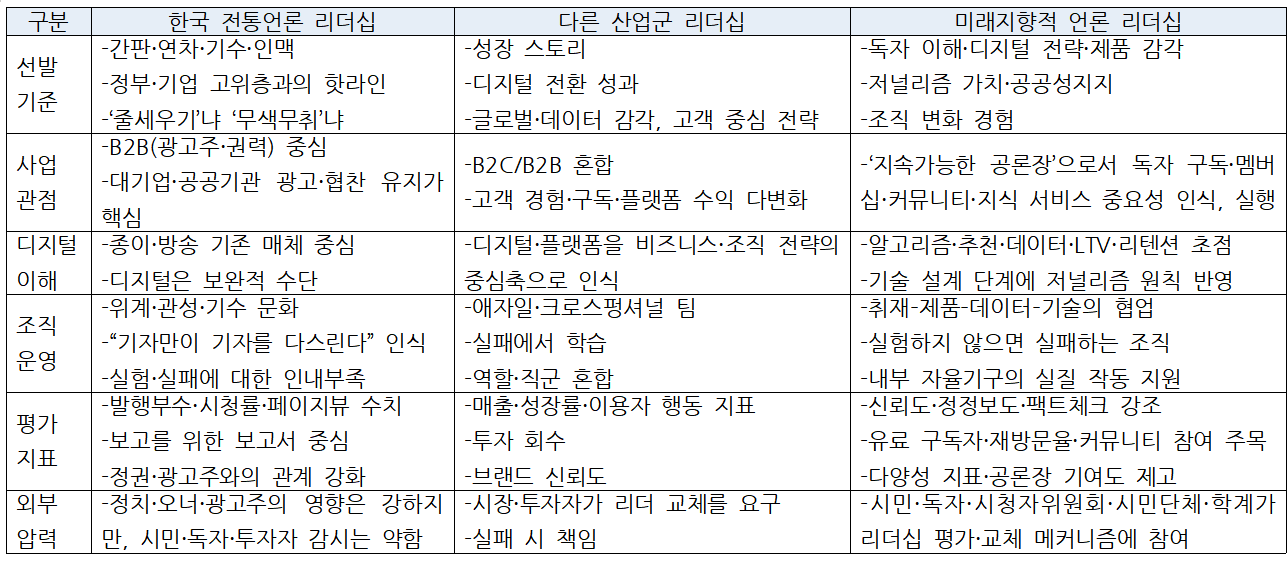 특히 언론의 신뢰 회복과 비즈니스 전환은 리더 교체 없이는 불가능하다. 광고·협찬 중심 구조를 유지하려는 리더, 클릭 장사·정파적 동원에 익숙한 리더, 독자 경험보다 권력·광고주를 먼저 보는 리더 아래서는 어떤 디지털 혁신과 전환도 신뢰 회복으로 이어지지 않고, 독자 기반 비즈니스로도 이어지지 않는다. 언론을 '지속가능한 공론장의 사업'으로 만들려면, 콘텐츠·기술·마케팅의 쇄신 이전에 리더를 바꾸는 사회적 압력이 선행돼야 한다.