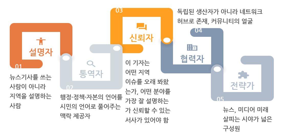 원론적이지만 기자 개인이 신뢰를 확보하면, 그 기자는 지역 내 교사, 활동가, 전문가, 주민 조직가와 자연스럽게 연결된다. 신문은 이런 관계들의 중심이 되어 지역의 다양한 목소리를 공정하게 큐레이션하고 플랫폼화하는 역할을 수행한다.