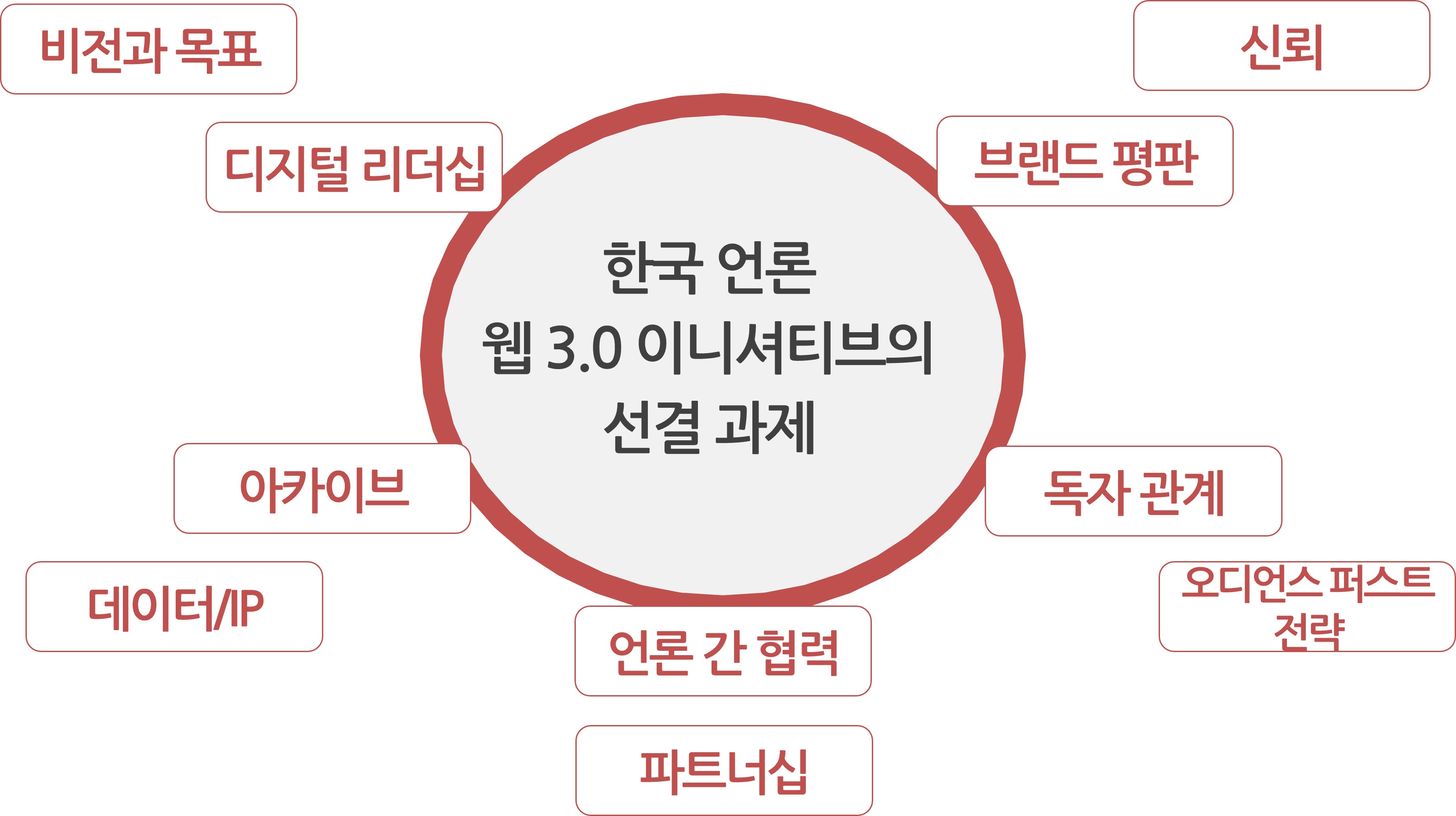 데이터베이스(콘텐츠 아카이브)도 마찬가지다. 자원의 자산화(Digital Asset Management)는 필수적이다. 인공지능 생태계에서도 언론사 안팎의 데이터를 수집하고 확보하는 역량이 관건이다. 웹3의 비즈니스는 결국 자산화된 것, 더 상업적으로는 IP에서 연결고리를 형성한다. 브랜드 평판 즉, 언론 신뢰의 영역이 이를 좌우한다. 저널리즘의 원칙에 대한 문제이다. (언론사에게) 웹3은 결국 실질적인 저널리즘의 경쟁 무대라고 할 수 있다.